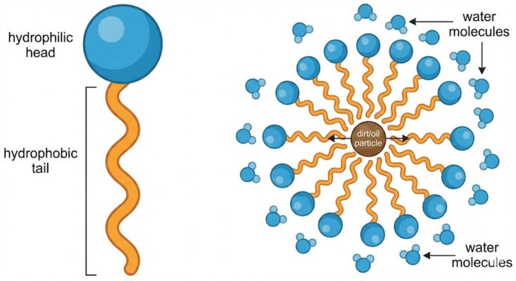 เวลาลูกเล่นทั้งวัน เหงื่อ ไขมันบนผิว และฝุ่นจะเกาะอยู่บนผิว น้ำเปล่าอย่างเดียวล้างออกไม่หมด ต้องอาศัย Surfactant มา “จับ” สิ่งสกปรก แล้วพาออกไปพร้อมกับน้ำ
